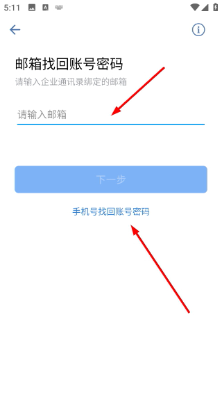 4、在邮箱找回账号密码界面输入绑定的邮箱,也能点击手机号找回账号密码切换找回方式。