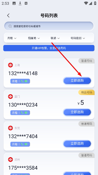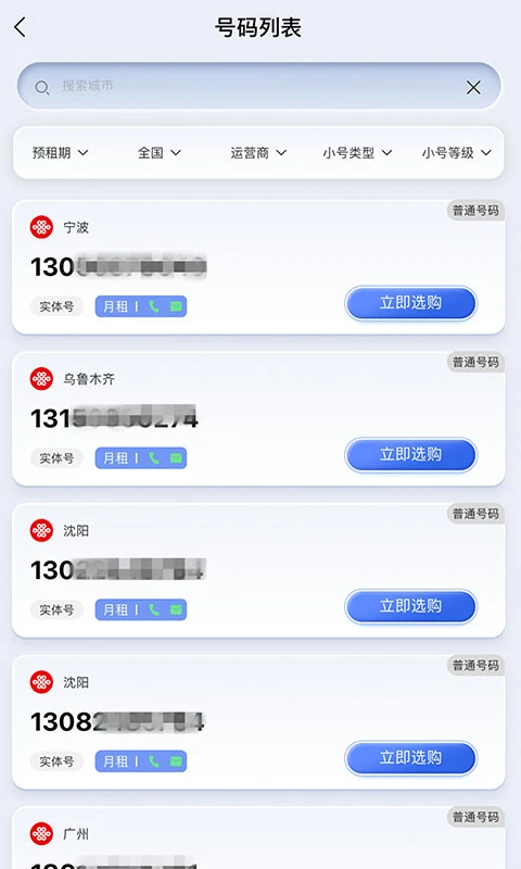 2、进入号码列表页筛选联通号码,点击目标号码的立即选购按钮。