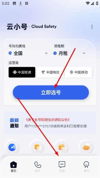 1、打开云小号APP,在首页选择运营商归属地和预租期点击立即选号。