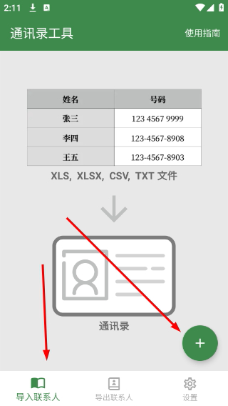 1、打开通讯录工具首页点击导入联系人,或点击加号按钮准备导入联系人文件。