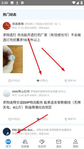 3、返回首页热门动态可对采购信息进行点赞,也能点击联系对接需求。
