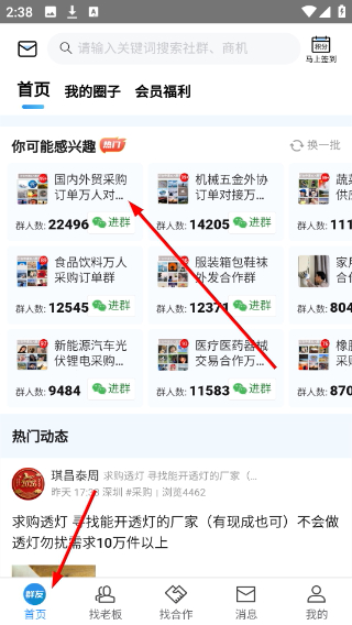 1、进入软件首页可浏览感兴趣的采购对接群,点击对应群组查看详情。