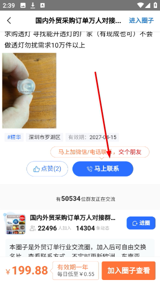 4、进入采购动态详情页可点击马上联系按钮,直接与发布者沟通合作。