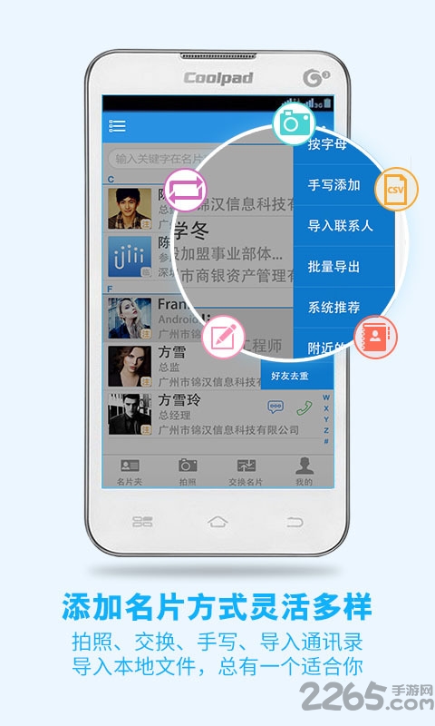 【添加名片】添加名片,方式多样,拍照添加、交换添加、手写添加、导入通讯录好友、导入本地文件,灵活好用。