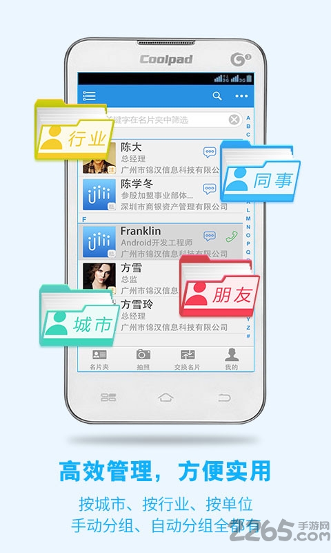 【名片夹】高效管理名片,按城市、按单位、按行业。也可自主创建分组,方便高效实用。