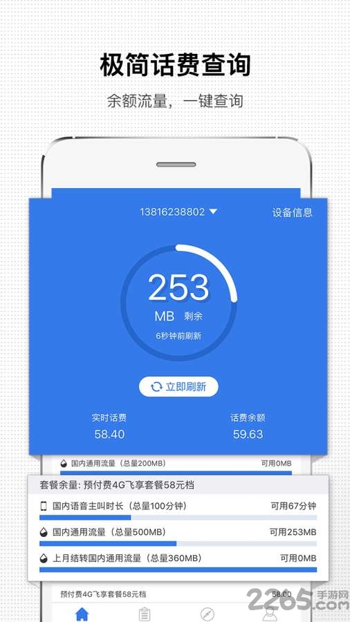 手机话费助手app一款在线话费充值软件,免去了线下充值的烦恼,非常的方便,手机上话费套餐的办理,余额查询,流量查询都能在软件中办到,需要的用户不要错过欢迎来265安卓网点击下载。