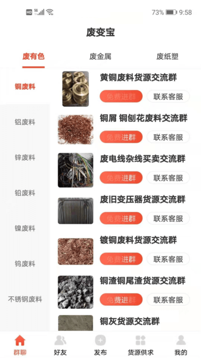 废变宝专为再生资源全产业链废料从业者量身打造的集再生资源废料群聊,通讯,货源供求,分类信息为一体的移动通信类APP。