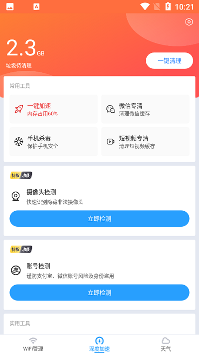 【网络加速】一键清理后台应用,减少信号段干扰,增强链接稳定性。