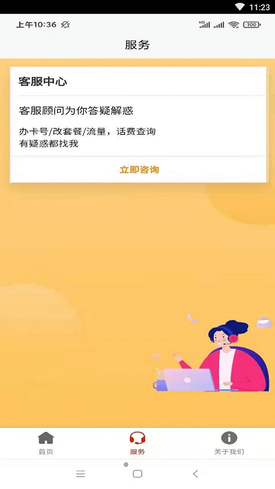 各类业务专区,查找营业厅,扫描二维码,在线客服,语音搜索,投诉建议,网络问题反馈等。