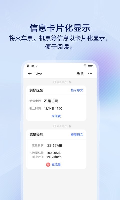 vivo信息最新版是vivo官方推出,软件拥有免费网络信息,信息卡片化显示,智能拦截垃圾信息,智慧信息服务等等功能,可以给予用户更棒的手机信息体验