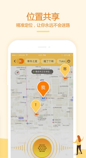 即时通讯工具,与微信不一样,不需要不断按手机屏幕,马上就可以一对一、一对多聊天,尤其是手机黑屏待机状态下也能收到对方的语音,群内成员随时保持通讯状态,只有说话时才会产生流量,手机待机状态下还会自动省点,电、钱都能省,语音清晰,非常实用