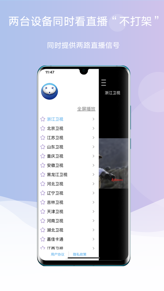 同时提供两路直播信号,支持两台设备同时看不同的直播频道(手机、PAD),家里再也不会为看新闻报道还是看综艺节目而"打架"了!