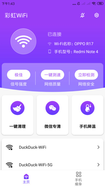彩虹wifi是一个免费的网络优化app,持智能防蹭网,还可以给网络实时测速.可轻松解决手机网速卡顿问题,告别网络"卡"、"慢"、"掉线".让用户可以更加安全的去使用热点.