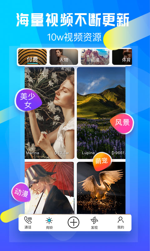 【海量视频铃声】视频内容类别丰富,萌宠、风景、明星、游戏、人物、古风、电音、动漫、影视、体育等,更多有趣好玩的视频铃声任你选。