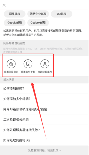 4、常见问题页面提供邮箱密码重置、安全手机更换及账号找回等解决方案。