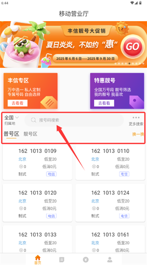 3、在首页可通过搜索栏查询号码,或浏览专区与靓号板块挑选心仪号码。