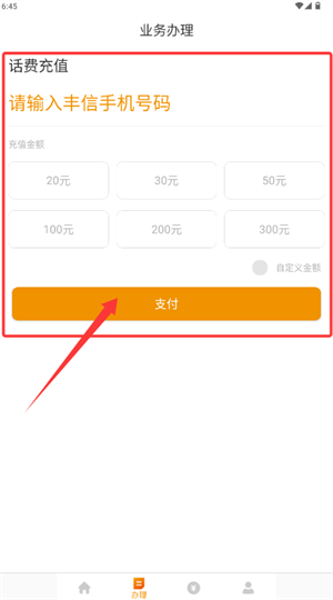 4、进入业务办理页输入手机号并选择充值金额,点击支付即可完成充值。