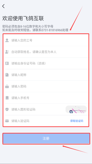 2、按照页面要求输入注册信息,比如你厂牌上的工号,密码,手机号码等信息,最后点击“注册”按钮