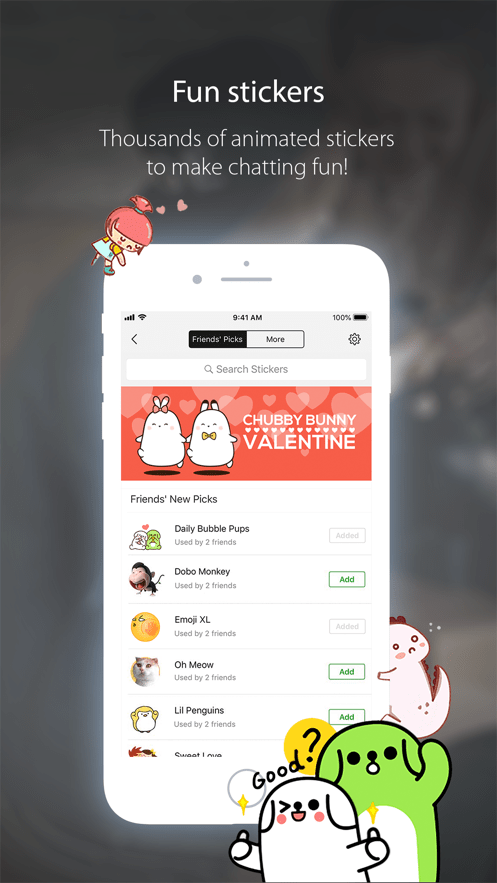 通过文字、照片、语音、视频、位置共享等方式向朋友发送信息。创建最多有500个成员的群聊。