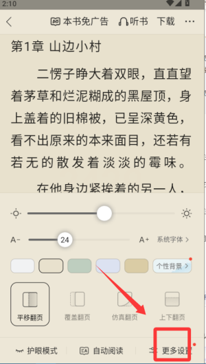 2、阅读时点屏幕中央调出菜单,可以设置字体大小和护眼背景。上滑翻页,长按文字能做笔记。