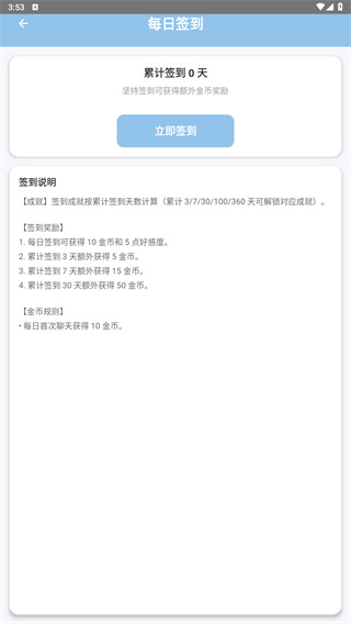 4、你也可以每天坚持签到,并获得金币和增加好感度,让你解锁更多的聊天功能在软件上。