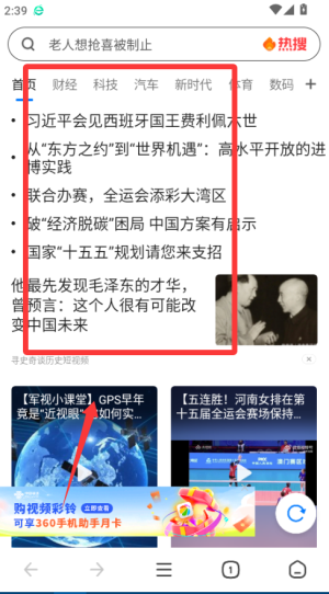 1、打开360浏览器后先在首页点击“资讯”入口,选择你感兴趣的类别比如科技、娱乐或体育。