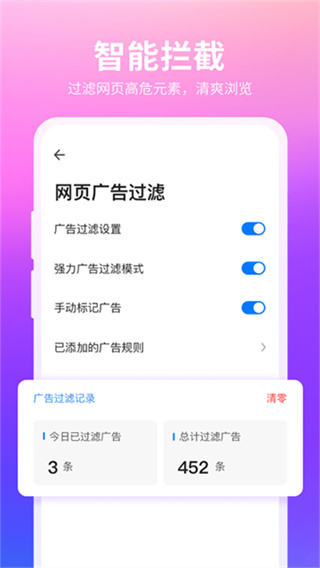 4、内置广告过滤组件,可智能识别页面推广内容并实现精准屏蔽,净化浏览视觉空间。