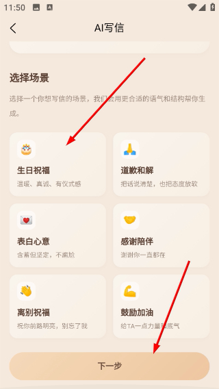 4、在写信页选择生日祝福等对应场景,点击下一步即可生成对应信件内容。