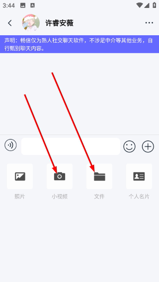 4、点击输入框右侧加号,可选择照片小视频文件个人名片等多种内容发送给好友。