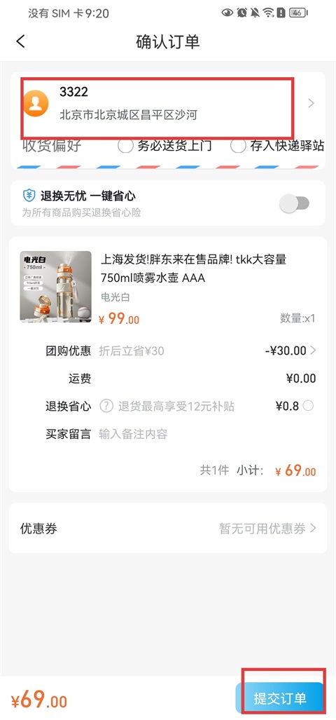 3、填写收货地址,确认无误后点击【提交订单】;