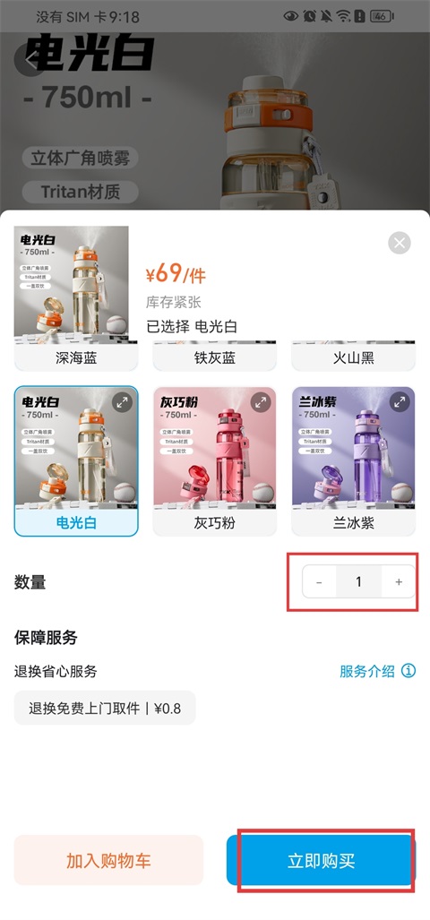 2、在选择页面,选择你想购买的商品规格及数量,点击【立即购买】继续;