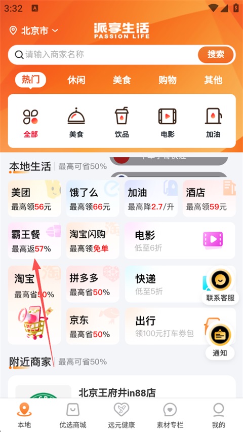 1、打开派享生活App,点击【霸王餐】;