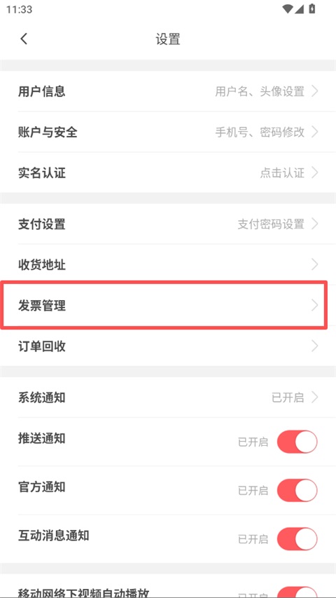 3、在设置页面中,点击"发票管理",进入发票信息列表;