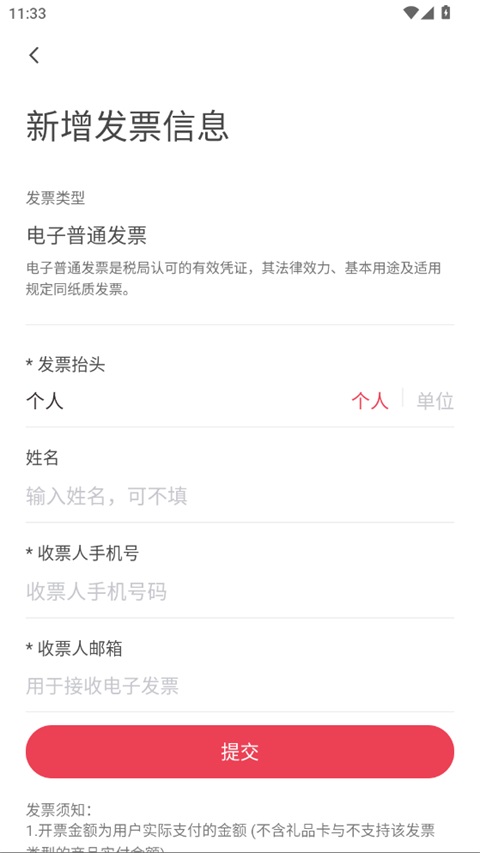 5、进入新增发票信息页面,填写信息必填项,信息核对无误后,点击"提交",完成发票信息添加。