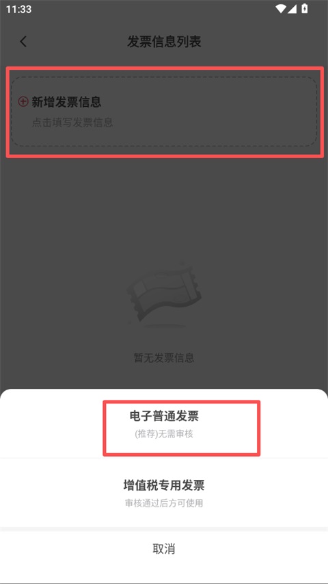4、点击"新增发票信息",在弹出的选项中选择发票类型(推荐"电子普通发票",无需审核);
