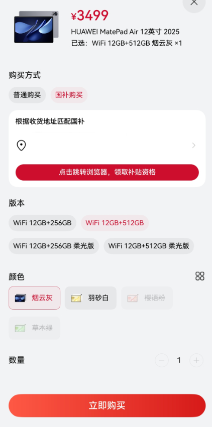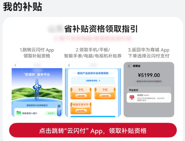 A:1、请您先确认是否已领取补贴券。领券方式:华为商城App>进入“国补活动页面”>选择所在地区及品类>点击“立即领取”或跳转云闪付/小程序领取。