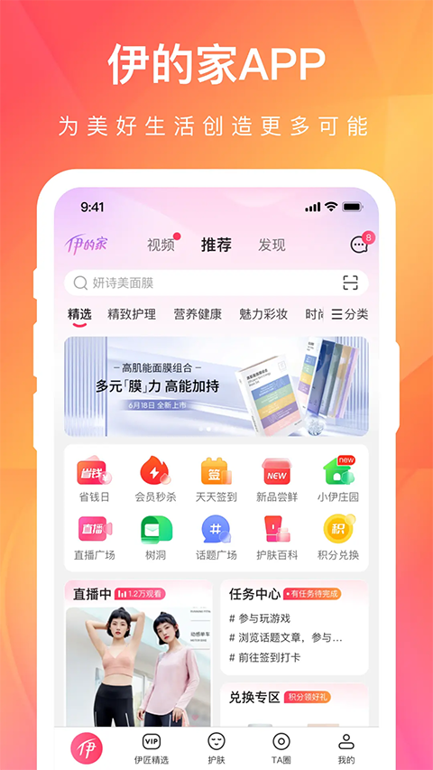 伊的家是一款专注于服务女性,以提高女性的生活品质为导向,致力于打造涵盖美丽、健康、护肤等主题于一体的综合性、便捷性、高端化的电商平台、为女性提供精致生活服务及文化的“美好生活社区”,让女性更加健康、美丽、自信,塑造内外兼备的精致女人。