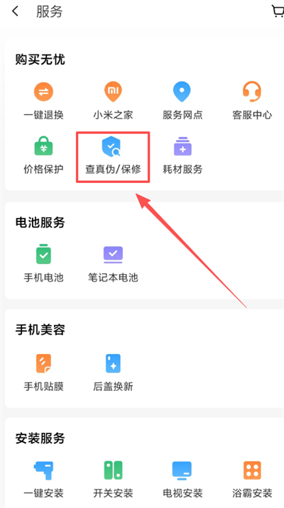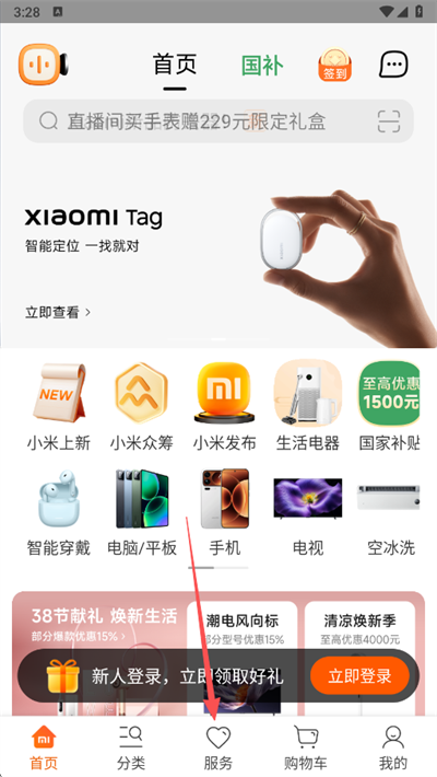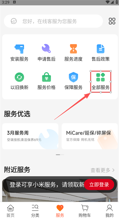 1、打开小米商城app,在首页点击底部导航栏的“服务”,进入服务界面
