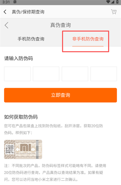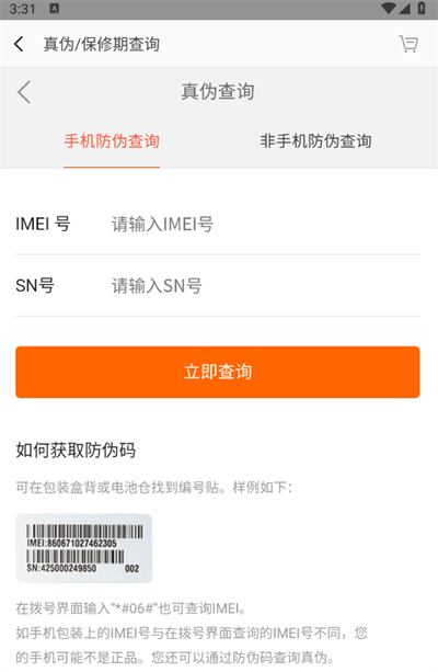 5、如果是手机的话,则输入IMEI号和SN号;如果不是手机,则直接输入防伪码,最后点击“立即查询”即可