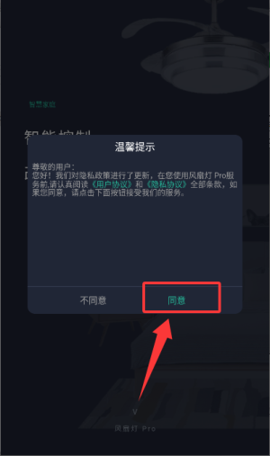 1、启动应用后阅览更新后的用户协议与隐私政策,确认后点击同意进入智慧家庭界面。