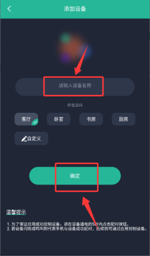 3、在添加设备页输入设备名称并选择房间,点击确定完成添加流程。