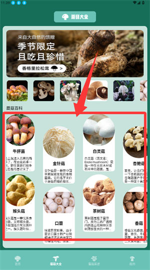 2、浏览蘑菇图鉴,点击指定品种查看详情。