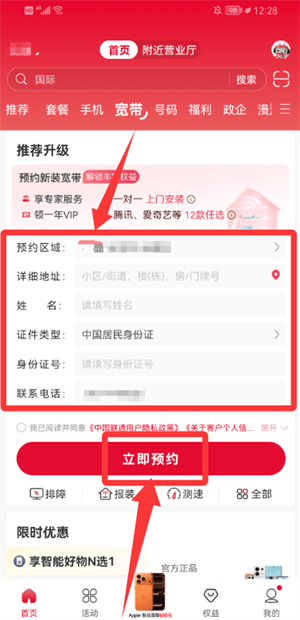 2、从首页选择宽带新装入口,进入预约信息填写页面。