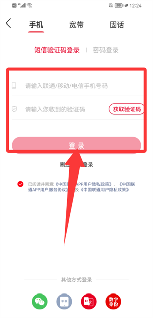 1、在登录页填写手机号及验证码,点击登录进入应用。