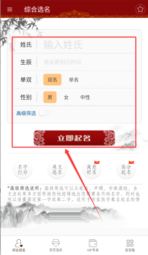 * 提供自助起名和系统智能推荐两种起名模式,可以轻松取出即适合命理、又音形意具佳的高分吉祥好名字