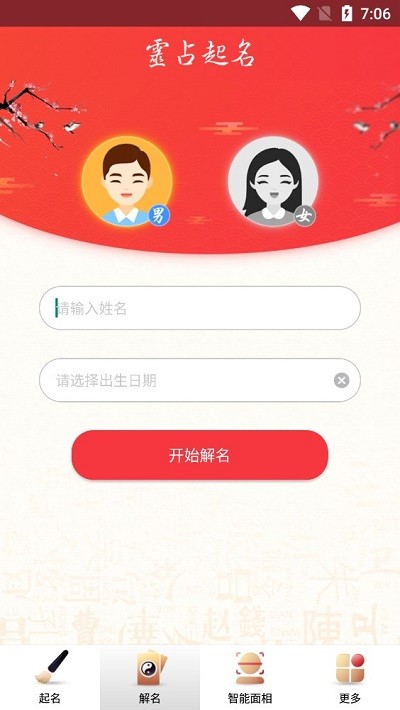 3、在解名的界面,输入男女双方的姓名和出生日期即可进行解名