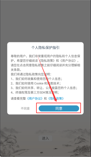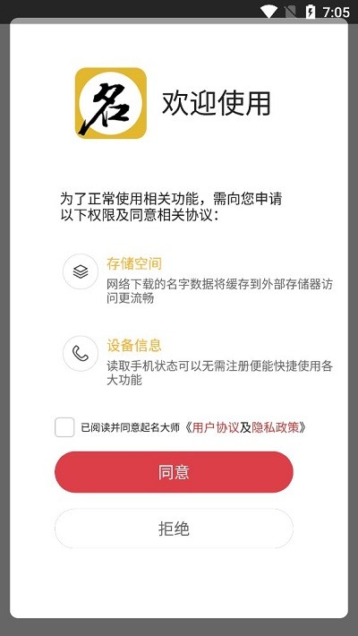 1、首先在本站下载起名大师app并进入软件,进入软件后,勾选用户协议及隐私政策,点击同意