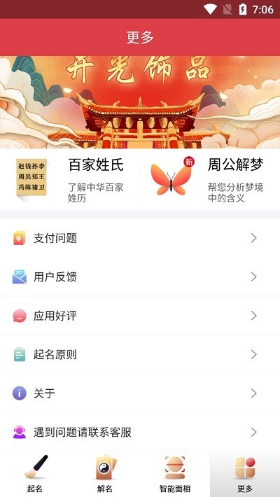5、在更多界面,为用户提供百家姓氏、周公解梦、用户反馈、起名原则等功能