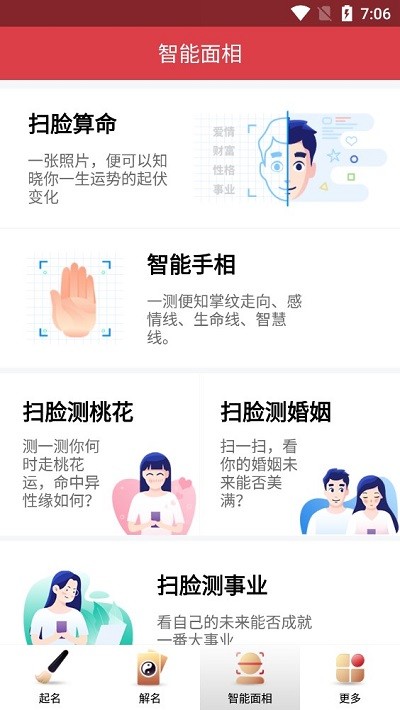 4、在智能面相界面,为用户提供扫脸算命、智能手相、扫脸测桃花、扫脸测婚姻、扫脸测事业