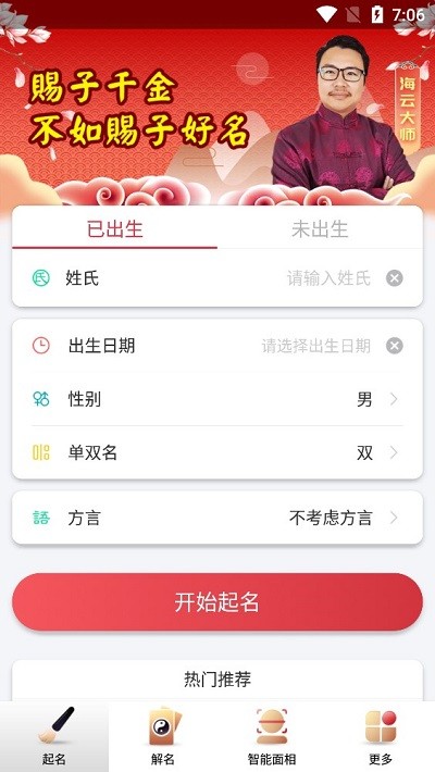 2、进入软件起名界面后,为用户提供已出生和未出生起名,输入姓氏、日期、性别、单双名等信息,然后点击开始起名即可完成起名